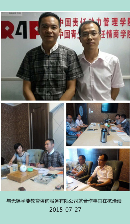 2015年07月27日,中国青少年(4R4P)责商学院与无锡学能教育咨询服务有限公司就合作事宜在杭洽谈,双方表示合作是强强结合,合作对双方有利,可以实现双方的资源整合,共同发展。无锡学能教育咨询服务有限公司总经理曾祥波表示一定要将4R4P发扬光大!